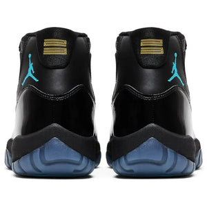 The 2025 edition of the Air Jordan 11 'Gamma Blue' brings back a colorway that initially debuted in 2013. The sleek design combines black ballistic mesh with a tonal patent leather mudguard. The black leather heel panel displays an embroidered Jumpman logo in Gamma Blue on the lateral side, while a Varsity Maize '23' stands out on the textile back tab. The cushioning setup takes the form of a black Phylon midsole with a full-length Air-sole unit. Underfoot, the blue-tinted rubber outsole features herringbone traction pods and an exposed carbon fiber shank plate.