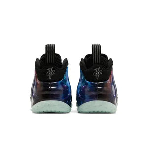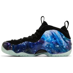 The 2025 edition of the Nike Air Foamposite One 'Galaxy' brings back a coveted colorway originally released during NBA All-Star Weekend in 2012. The retro hoops shoe features a nebular design in blue and violet hues throughout the molded Foamposite upper. Black nubuck detailing is utilized on the collar and eyestay, accented with a tonal embroidered mini-Swoosh on the lateral forefoot. A glow-in-the-dark translucent rubber outsole yields durable traction underfoot.