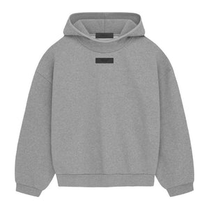 The Essentials hoodie is made in core fleece and designed with volume to create a round, cropped silhouette. Details include a mock neckline, side seam pockets, rib-knit cuffs, and waist hem. New minimalist branding is seen in the rubberized Essentials Fear of God black bar on the center front. A Fear of God rubberized label is on the hood.