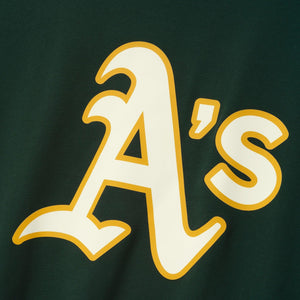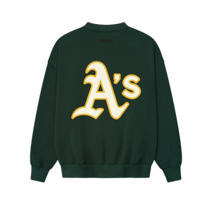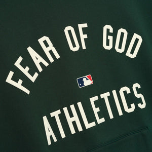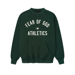 The Athletics Sport Crewneck is crafted from core fleece, offering an elevated balance of softness, structure, and lasting comfort. Cut in a relaxed sport fit, it drapes with more ease through the body and extended length compared to the Essentials classic silhouette. The front features a bold puffer-print graphic reading “Fear of God Athletics” alongside the MLB insignia, while the back is finished with the official A's logo. Additional details include a kangaroo pocket, rib-knit collar, cuffs and hem. The signature rubberized Fear of God Essentials label accents the back.