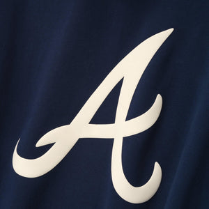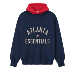The Braves Sport Hoodie is crafted from core fleece, offering an elevated balance of softness, structure, and lasting comfort. Cut in a relaxed sport fit, it drapes with more ease through the body and extended length compared to the Essentials classic silhouette. The front features a bold puffer-print graphic reading "Atlanta Essentials" alongside the official MLB insignia, while the back is finished with the authentic Atlanta "A" logo. Additional features include a contrasting double-layered hood, side seam pockets, elastic bindings at the cuffs and waist hem. The signature rubberized Fear of God Essentials label accents the hood.