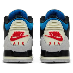 Built for big kids, the Air Jordan 3 Retro OG GS 'Rare Air' draws inspiration from the imperfections found on early Air Jordan samples. The classic silhouette employs a black tumbled leather upper with suede forefoot and heel overlays in charcoal and light grey, respectively. Chile Red accents settle on the Jumpman icon atop the tongue and the Nike Air branding that graces the back heel, with the right shoe featuring a flipped logo that suggests a factory defect.