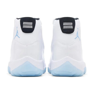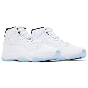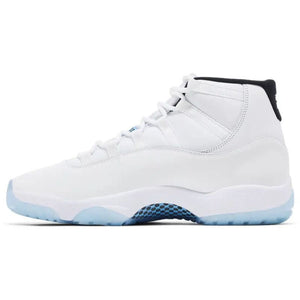 The 2024 edition of the Air Jordan 11 Retro 'Legend Blue / Columbia' brings back an OG colorway of the championship model. Laces feed through webbing eyelets to secure the white leather upper, bolstered with a tonal patent leather mudguard and marked with a blue embroidered Jumpman on the lateral collar. Contrasting black accents land on the interior lining and back tab, featuring signature '23' branding. A white Phylon midsole packs a full-length Air-sole unit for lightweight cushioning. Underfoot, a blue-tinged translucent rubber outsole reveals a carbon fiber shank plate for midfoot stability.