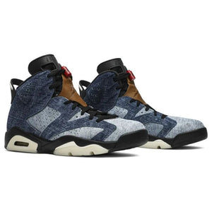 Famously inspired by Michael Jordan's German sports car, the Air Jordan 6 Retro conveys speed and class. This version—unveiled in December 2019—transforms the icon from court performer to street ready through a 'Washed Denim' upper with the signature synthetic tongue. Touches of Varsity Red are placed on the rear spoiler and Jumpman branding on the neoprene sleeve. Its Air-Sole is set atop a translucent rubber tread pattern.