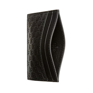 The Gucci Card Case Microguccissima Leather Black is crafted using black leather and features the iconic Microguccissima print. This made-in-Italy authentic Gucci Card Case Microguccissima Leather in Black offers you both style and functionality. The black leather card case (wallet) features four credit card pockets, two on each side, and one large central pocket. The Gucci Card Case Microguccissima Leather in Black is compact, measuring 10 cm in width by 7 cm in height. The card case is made from black calf leather.