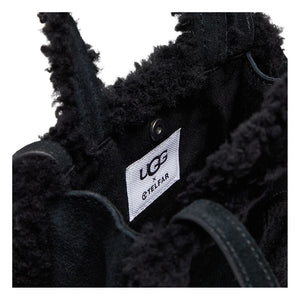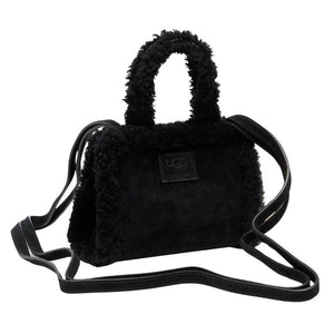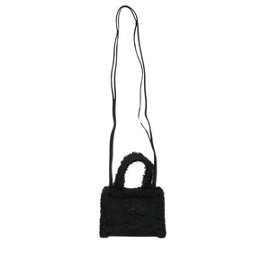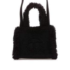 TELFAR X UGG Fleece Small Shopping Bag in Black. This mini tote is constructed of faux fabric in black with the iconic raised Telfar logo at the front. The shoulder bag has thin black handles and a long crossbody strap. The bag opens to a black fabric interior.