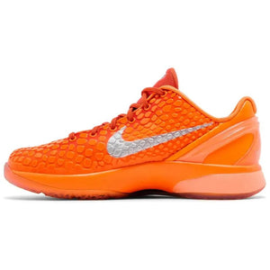 Made for big kids, the Nike Zoom Kobe 6 GS 'Total Orange' showcases a bold citrus hue on a micro-mesh upper covered in polyurethane 'islands,' creating a reptilian texture that plays off Kobe Bryant's 'Black Mamba' persona. Kobe's molded sheath logo decorates the tongue in metallic silver, matching the printed Swoosh that graces the quarter panel. The sneaker rides atop a matching orange Cushlon midsole with Zoom Air cushioning in the forefoot.