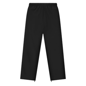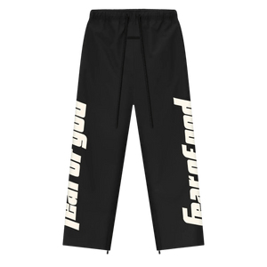 The MLB Trackpants are constructed in nylon-spandex and designed with a wide straight leg fit, similar to the Essentials Lounge Sweatpant. Details include a bold Fear of God puffer print logo down the leg, elastic waistband, elongated drawstring, and side pockets, and adjustable zippers at the bottom hems. The Fear of God Essentials black bar at the center front.