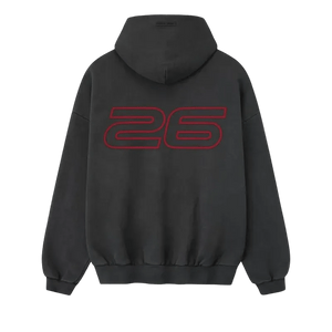 The Heavy Fleece Hoodie is crafted from 520gsm heavy fleece and treated with a pigment dye to create rich depth of color. Designed in an oversized 90s-inspired silhouette, it features exaggerated proportions with dropped shoulders for a relaxed drape. The hoodie is defined by HD-printed graphics—“Fear of God Essentials” logo on the front and “26” on the back. Finishing details include a kangaroo pocket, rib-knit cuffs, waist-hem and a Fear of God Essentials rubberized label stitched on the hood.