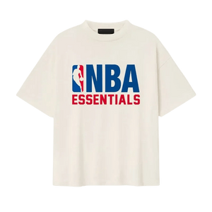 The NBA 90s Tee is cut from 100% cotton jersey, offering a soft yet substantial hand feel. Designed in an oversized 90s-inspired silhouette, it features exaggerated proportions with dropped shoulders for a relaxed drape. The front is defined by a bold puffer-print application of the "NBA ESSENTIALS" lockup, alongside the authentic NBA insignia. The signature rubberized Fear of God Essentials label at the collar.