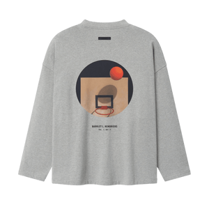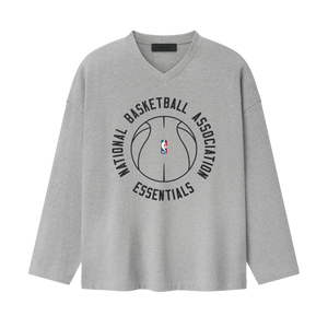 The NBA x Barkley Hendricks V-Neck Long Sleeve Tee is cut from 100% cotton heavy jersey, offering a soft yet substantial hand feel. Designed in an oversized 90s-inspired silhouette, it features exaggerated proportions with dropped shoulders for a relaxed drape. The front features a puff-printed NATIONAL BASKETBALL ASSOCIATION ESSENTIALS graphic paired with the official NBA logo, while the back showcases Barkley Hendricks’ iconic Basketball Series artwork rendered in a 3D print that captures the texture and emotion of his brushstrokes. The Fear of God Essentials label is at the collar.