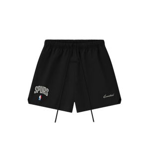 The Spurs Classic Short is made from a stretch-woven fabric and finished with a full mesh liner, delivering breathable comfort within a timeless athletic-fit silhouette. A SPURS NBA lockup are branded on leg and script Essentials print complements the other. Additional details include an encased elastic waistband with elongated drawstrings, side pockets. A Fear of God Essentials rubberized label is stitched on the center front.