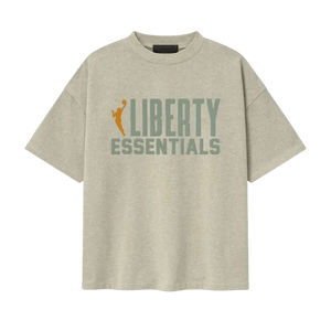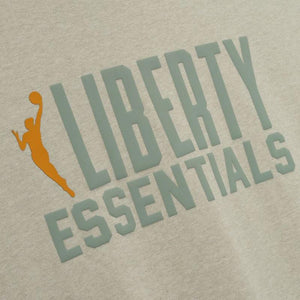 The Liberty 90s Tee is cut from 100% cotton jersey, offering a soft yet substantial hand feel. Designed in an oversized 90s-inspired silhouette, it features exaggerated proportions with dropped shoulders for a relaxed drape. The front is defined by a bold puffer-print application of the "Liberty Essentials" lockup, alongside the authentic NBA insignia. The signature rubberized Fear of God Essentials label at the collar.
