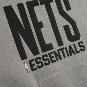 The Nets Sport Crewneck is crafted from core fleece, offering an elevated balance of softness, structure, and lasting comfort. Cut in a relaxed sport fit, it drapes with more ease through the body and extended length compared to the Essentials classic silhouette. The front features a bold puffer-print graphic "Nets Essentials " alongside the authentic NBA logo, while the back showcases the official Brooklyn Nets logo. Additional features include kangaroo pocket, rib-knit at the collar, cuffs and waist hem. The signature rubberized Fear of God Essentials label accents the hood.