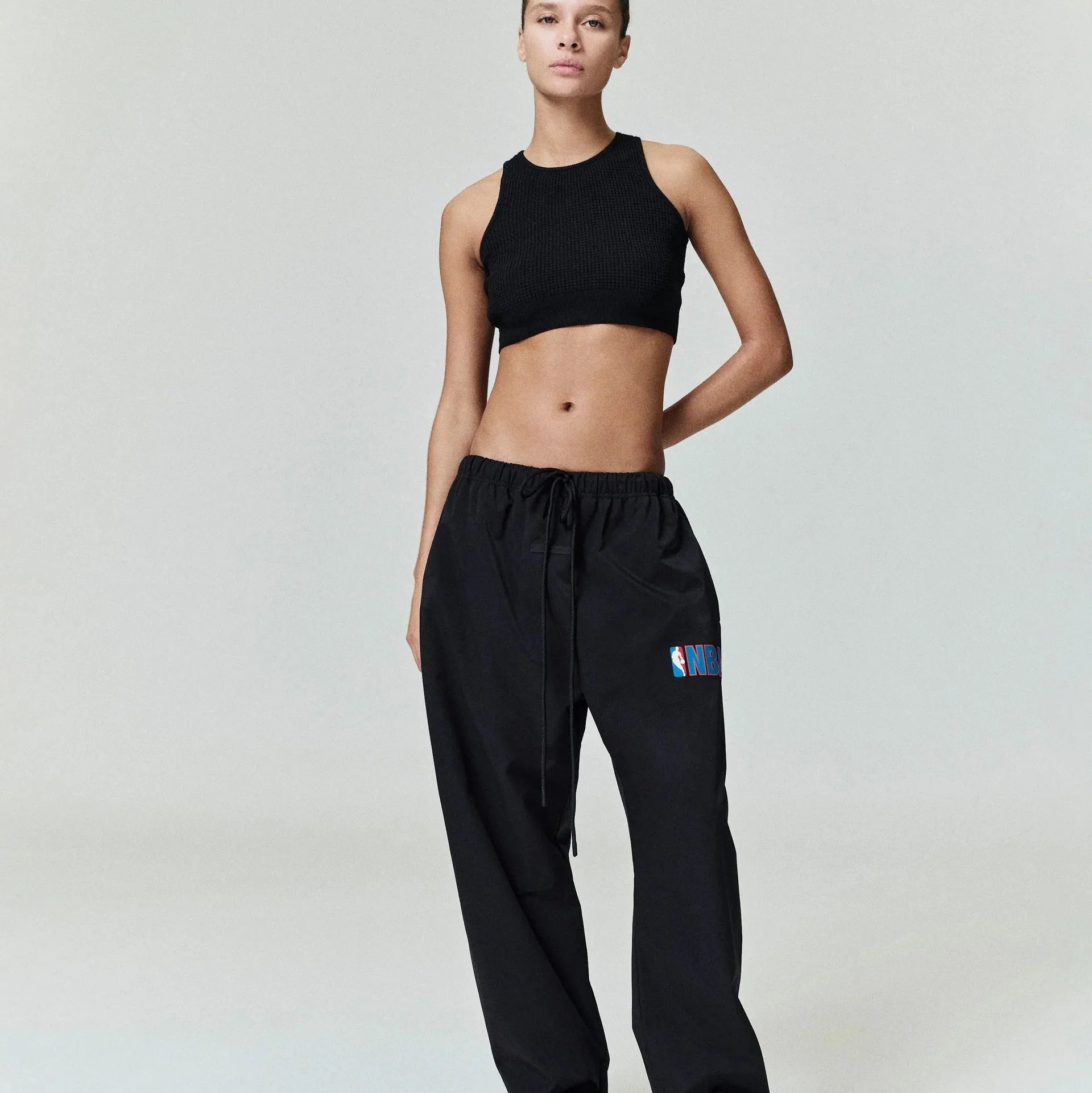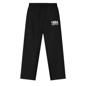 The NBA Tearaway Sweatpant is crafted from nylon-spandex to offer stretch comfort with a voluminous wide-leg silhouette with metal snap hardware. The leg features NBA ESSENTIALS puffer-print lockup paired with the official NBA logo. Finishing details include an encased elastic waistband with elongated drawcords, side seam pockets, and a Fear of God Essentials rubberized label stitched at the center front.
