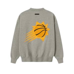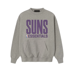 The Suns Sport Crewneck is crafted from core fleece, offering an elevated balance of softness, structure, and lasting comfort. Cut in a relaxed sport fit, it drapes with more ease through the body and extended length compared to the Essentials classic silhouette. The front features a bold puffer-print graphic "Suns Essentials " alongside the authentic NBA logo, while the back showcases the official Phoenix Suns logo. Additional features include kangaroo pocket, rib-knit at the cuffs and waist hem. The signature rubberized Fear of God Essentials label accents the hood.