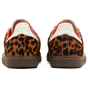 Launching as part of the 'Cheetah Pack,' the adidas Women's Samba OG 'Preloved Red' gives the classic indoor soccer shoe an exotic makeover. Dressed entirely in faux brown pony hair, the upper features black cheetah spots with contrasting off-white leather accents on the serrated three-stripes and black tab. The low-profile silhouette is secured with brick red laces, matching the synthetic leather lining. Anchoring the sneaker is a durable gum rubber sole unit.