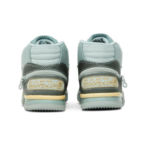 The Travis Scott x Nike Air Trainer 1 SP ‘Grey Haze’ delivers a utilitarian take on a classic ‘80s silhouette. The Houston rapper replaces the shoe’s traditional leather construction with a textile build in a pale aqua finish. Cactus Corporation branding appears on the adjustable midfoot strap and rubberized heel overlay, featuring a stash pocket with zippered closure. Scott’s signature reverse Swoosh graces the medial side, while the rapper’s Cactus Jack logo adorns the perforated nubuck tongue. A removable ripstop shroud (which can be stored in a tongue pocket when not in use) can be snapped onto the upper for protection against the elements.