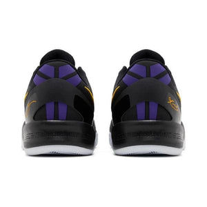 The Nike Kobe 8 Protro 'Lakers Away' features a black engineered mesh upper with tonal no-sew overlays and a gold embroidered Swoosh. Kobe Bryant's sheath logo graces the tongue and back heel in Court Purple. Lightweight cushioning is provided by a drop-in React foam midsole, replacing the Lunarlon foam of the original Kobe 8. Underfoot, the herringbone-traction rubber outsole reveals a bottom-loaded carbon fiber shank plate for midfoot stability.