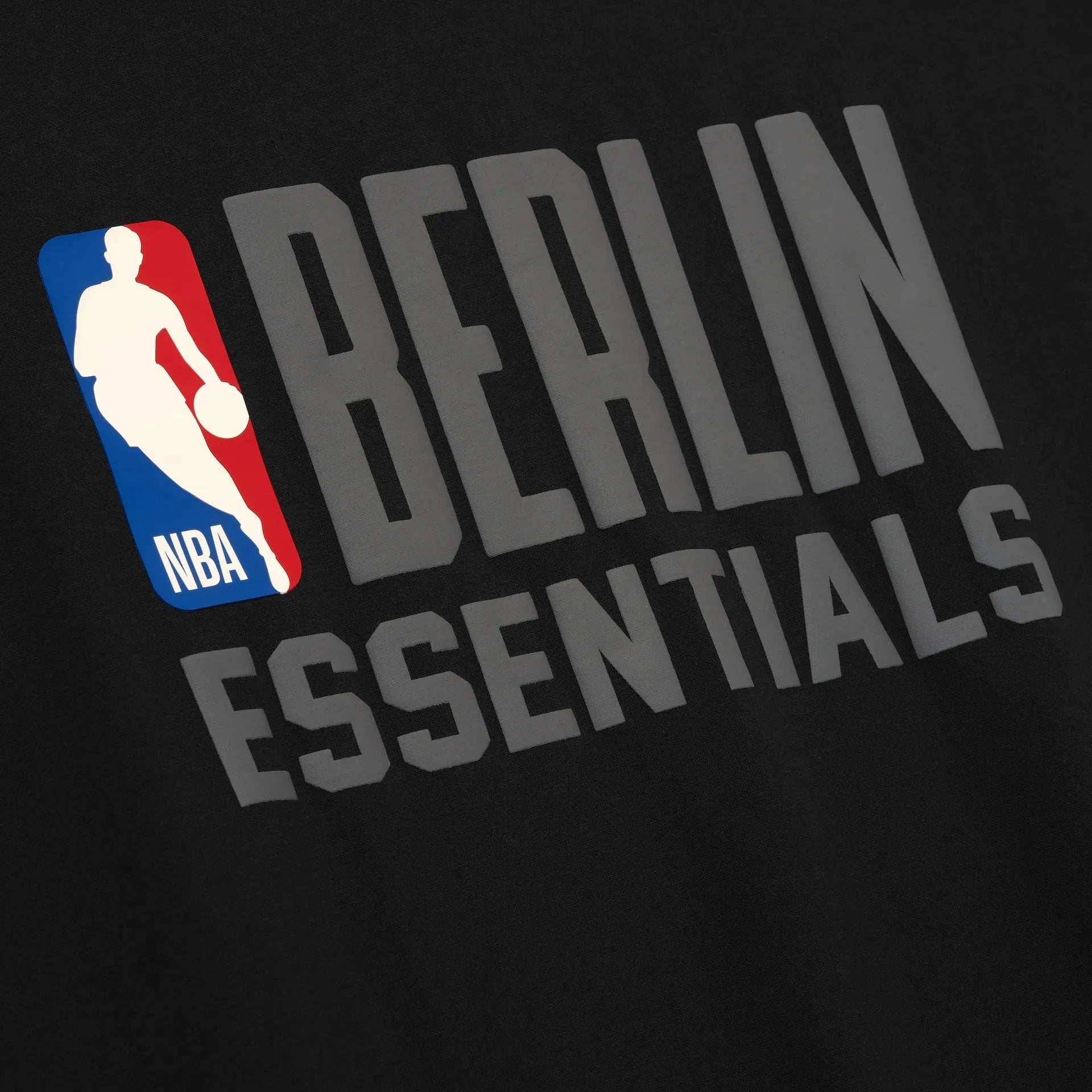 The Berlin 90s Tee is cut from 100% cotton heavy jersey, offering a soft yet substantial hand feel. Designed in an oversized 90s-inspired silhouette, it features exaggerated proportions with dropped shoulders for a relaxed drape. The front is defined by a puff-printed BERLIN ESSENTIALS lockup, alongside the authentic NBA insignia in a HD print. The Fear of God Essentials label is at the collar.