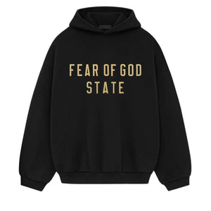 The Essentials Fleece Hoodie has been upgraded in a heavier 480gsm core fleece to provide additional body and structure. A collegiate-inspired "Fear of God State" graphic is screen printed on the front. Details include an overlapped neckline hoodie, rib-knit cuffs, waist-hem, and side pockets. The Essentials Fear of God rubberized label is at the back collar.