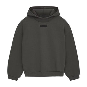 The Fear of God Essentials Ink Hoodie features a relaxed fit, a mock neckline, long sleeves, side seam pockets, an attached hood, and a rubber brand label at the center front.