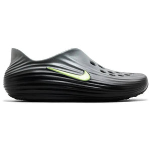 The Nike ReactX Rejuven8 'Black Volt' delivers a comfortable slip-on recovery shoe built with molded ReactX foam. Finished in Cool Grey, the top half is highlighted by ventilation holes throughout the vamp. The bottom half is rendered in a solid black finish and includes a radial-pattern rubber outsole. On the lateral side, a molded Swoosh in Volt enlivens the neutral design with a neon pop of color.