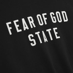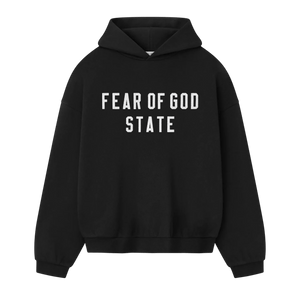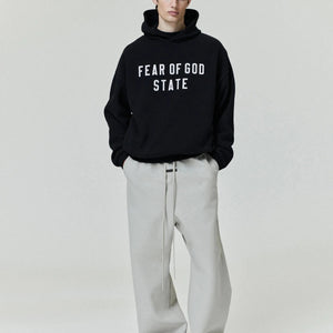 The 90's Fit Hoodie is made from 380gsm core fleece to provide ideal comfort and structure. The piece features a 90s fit with oversized proportions and dropped shoulders. A "Fear of God State" satin twill lettering is branded across the front. Details include a double-layer hood, side pockets, rib-knit cuffs and waist-hem. A Fear of God Essentials rubberized label is stitched on the hood.