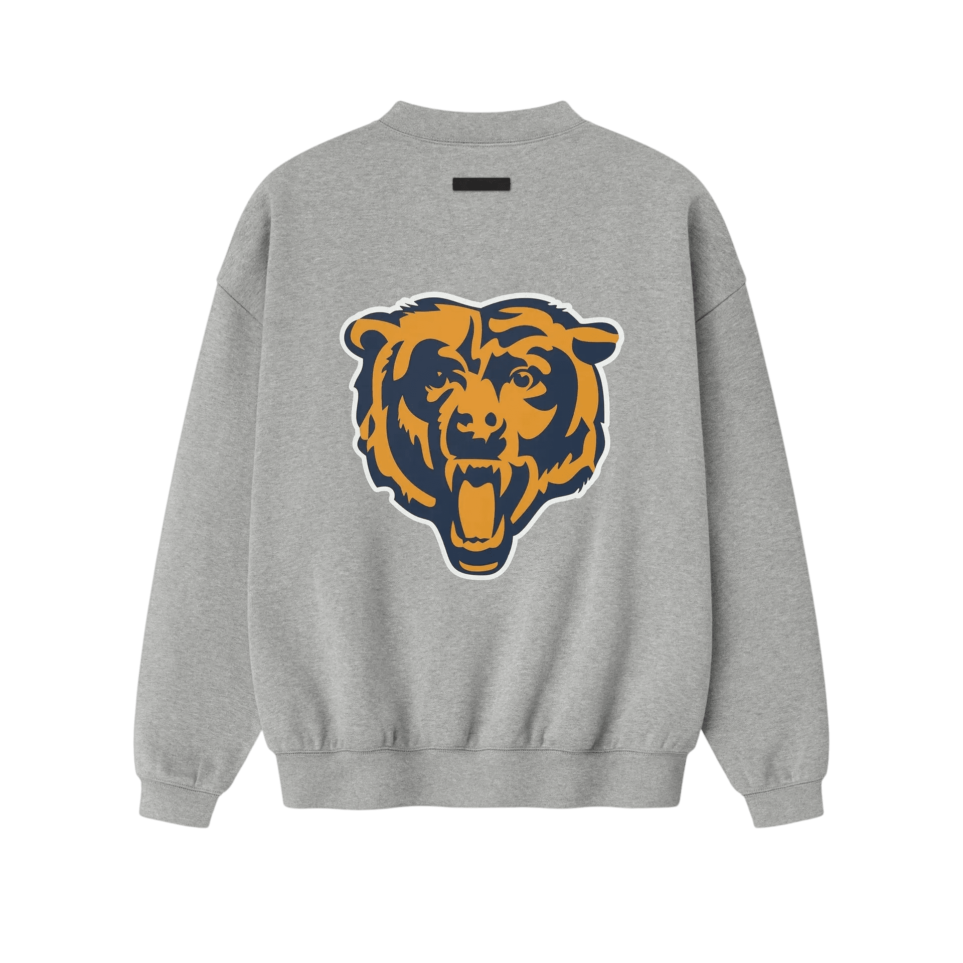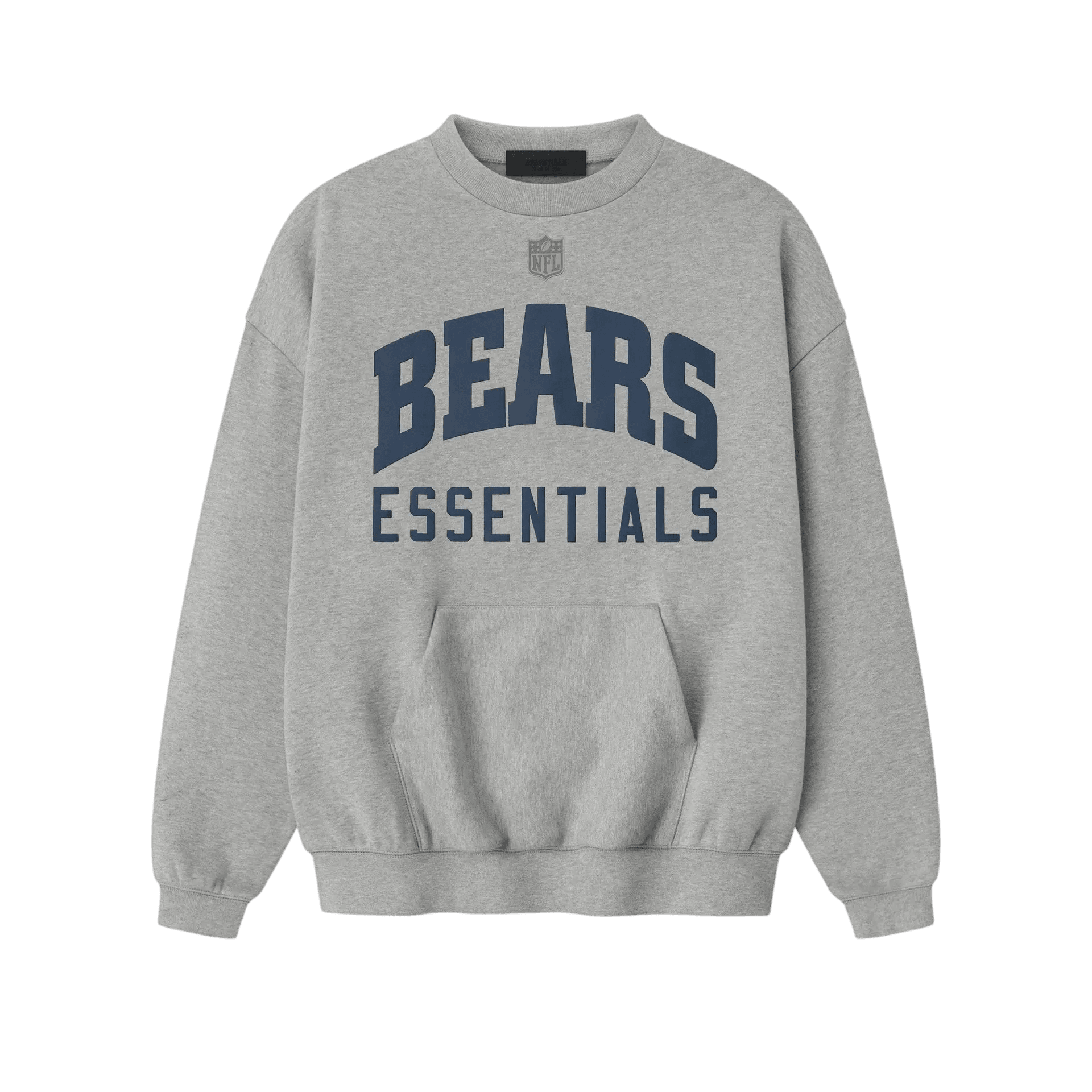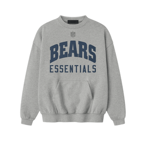 The Bears Sport Crewneck is crafted from heavy 480gsm core fleece and cut in a relaxed sport fit. The front features a bold "Bears Essentials" puff-print graphic, while the back displays the official Chicago Bears logo. Additional details include a kangaroo pocket and rib-knit collar, cuffs, and waist hem. The look is finished with the signature rubberized Fear of God Essentials label.