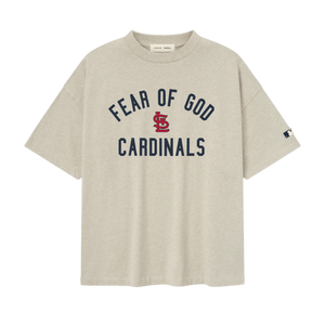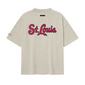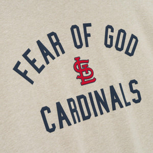 The Cardinals 90s Tee is cut from 100% cotton jersey, offering a soft yet substantial hand feel. Designed in an oversized 90s-inspired silhouette, it features exaggerated proportions with dropped shoulders for a relaxed drape. The front is defined by a bold puffer-print application of the "Fear of God Cardinals" lockup, alongside the MLB insignia on the sleeve. Across the back, an official St. Louis logo anchors the piece with the signature rubberized Fear of God Essentials label at the collar.