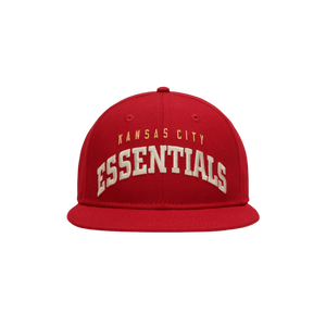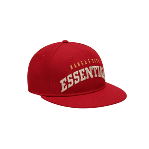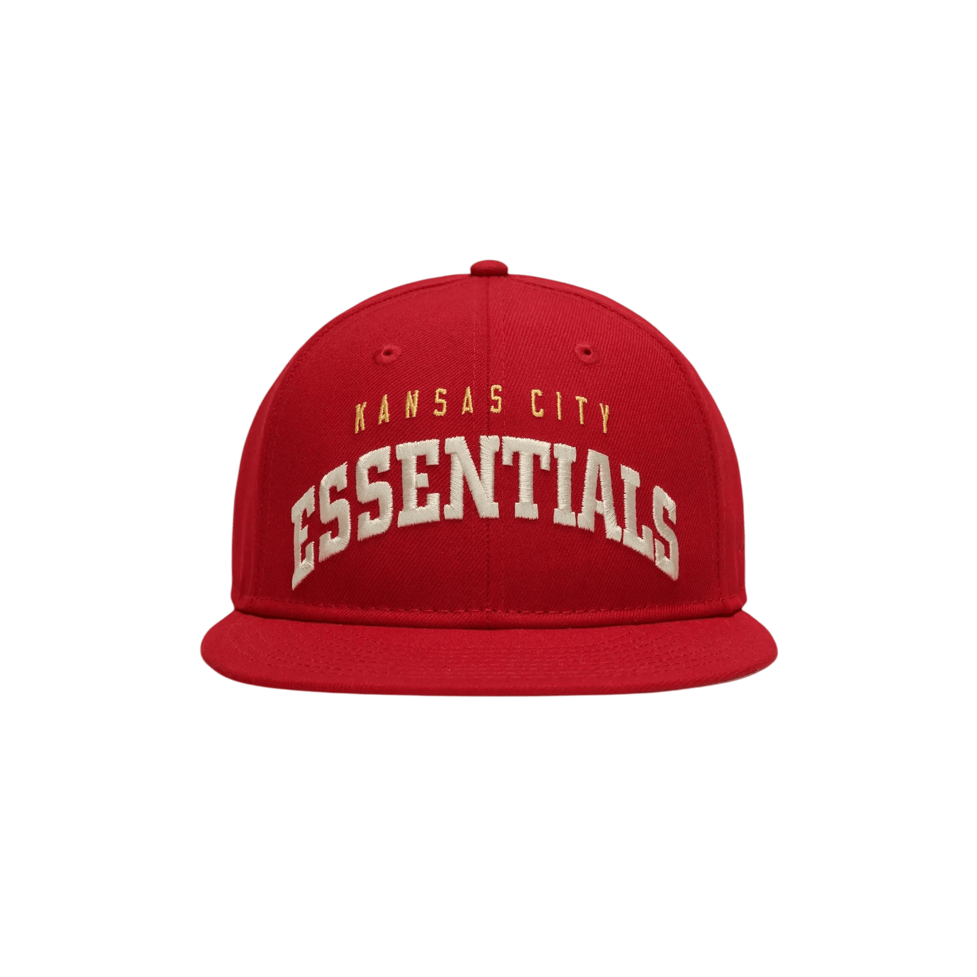 The Fear of God Essentials Chiefs 9Fifty RC Snapback Cap features a "Kansas City Essentials" lockup, complemented by the official Kansas City Chiefs logo at the back. The 9Fifty RC or "Retro Crown" is designed for a more vintage, casual feel. Additional features include an embroidered New Era logo on the side and an adjustable snapback closure at the rear.