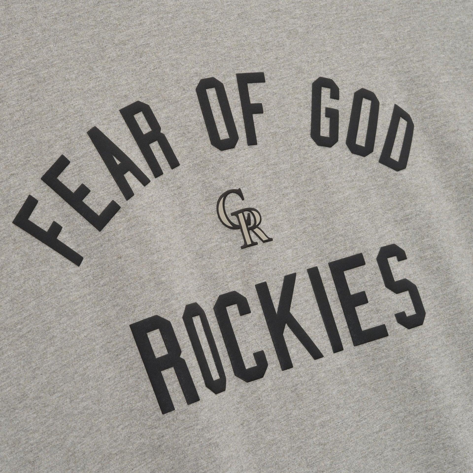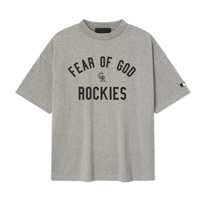 The Rockies 90s Tee is cut from 100% cotton jersey, offering a soft yet substantial hand feel. Designed in an oversized 90s-inspired silhouette, it features exaggerated proportions with dropped shoulders for a relaxed drape. The front is defined by a bold puffer-print application of the "Fear of God Rockies" lockup, alongside the MLB insignia on the sleeve. Across the back, an official Colorado logo anchors the piece with the signature rubberized Fear of God Essentials label at the collar.