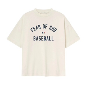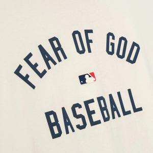 The MLB 90s Tee is cut from 100% cotton jersey, offering a soft yet substantial hand feel. Designed in an oversized 90s-inspired silhouette, it features exaggerated proportions with dropped shoulders for a relaxed drape. The front is defined by a bold puffer-print application of the "Fear of God Baseball" lockup, alongside the MLB insignia. The signature rubberized Fear of God Essentials label at the collar.