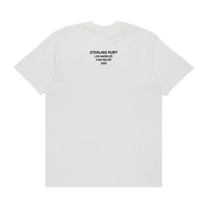 The design features original artwork by Sterling Ruby, who reimagined the brand’s signature box logo with an electric green and pink backdrop. The back of the design reads, “Sterling Ruby / Los Angeles / Fire Relief / 2025,” in small black text.