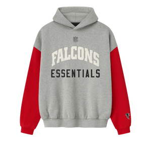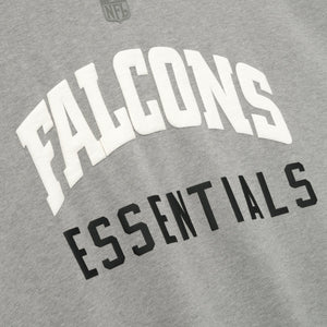 The Falcons Sport Hoodie is crafted from heavy 480gsm core fleece and cut in a relaxed sport fit. The front features a bold "Falcons Essentials" puff-print graphic paired with the official NFL shield logo. Additional features include, contrasting sleeves, side pockets, rib-knit at the cuffs and waist hem. The signature rubberized Fear of God Essentials label accents the hood.