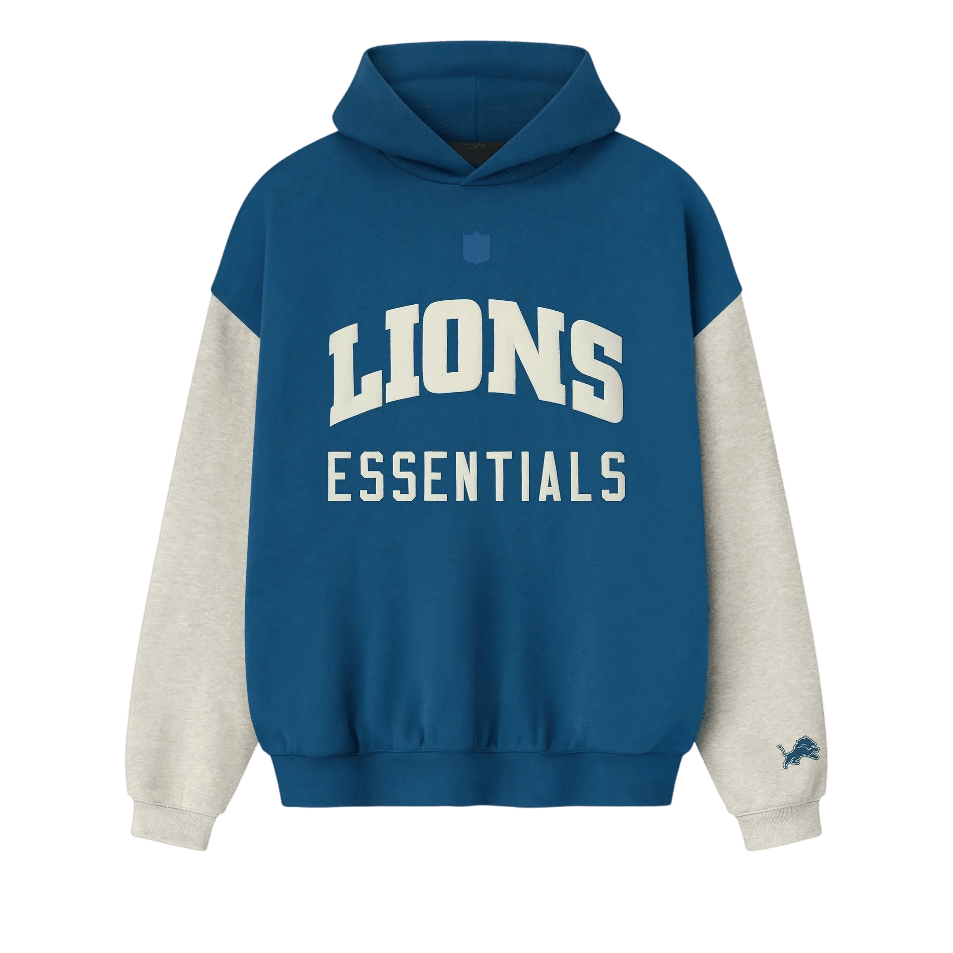 The Lions Sport Hoodie is crafted from heavy 480gsm core fleece and cut in a relaxed sport fit. The front features a bold "Lions Essentials" puff-print graphic paired with the official NFL shield logo. Additional features include, contrasting sleeves, side pockets, rib-knit at the cuffs and waist hem. The signature rubberized Fear of God Essentials label accents the hood.