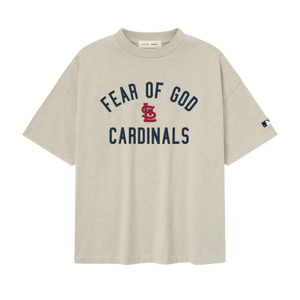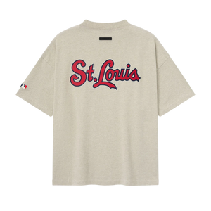 The Cardinals 90s Tee is cut from 100% cotton jersey, offering a soft yet substantial hand feel. Designed in an oversized 90s-inspired silhouette, it features exaggerated proportions with dropped shoulders for a relaxed drape. The front is defined by a bold puffer-print application of the "Fear of God Cardinals" lockup, alongside the MLB insignia on the sleeve. Across the back, an official St. Louis logo anchors the piece with the signature rubberized Fear of God Essentials label at the collar.