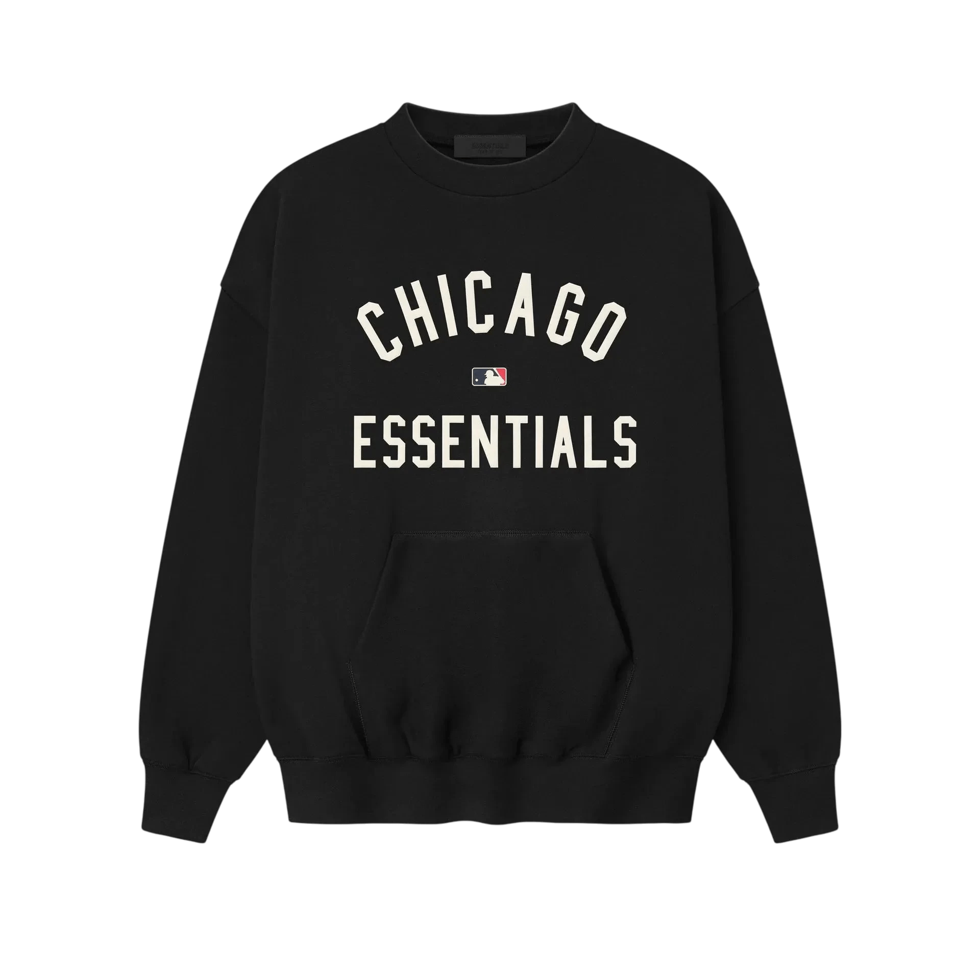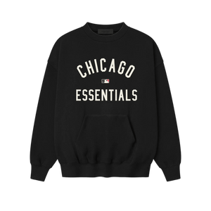 The White Sox Sport Crewneck is crafted from core fleece, offering an elevated balance of softness, structure, and lasting comfort. Cut in a relaxed sport fit, it drapes with more ease through the body and extended length compared to the Essentials classic silhouette. The front features a bold puffer-print graphic reading “Chicago Essentials” alongside the MLB insignia, while the back is finished with the official White Sox logo. Additional details include a kangaroo pocket, rib-knit collar, cuffs and hem. The signature rubberized Fear of God Essentials label accents the back.