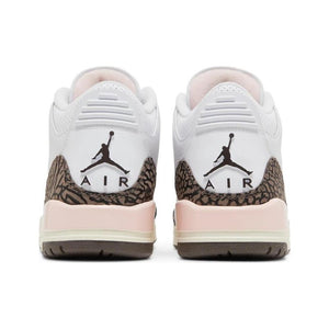 The women’s Air Jordan 3 Retro ‘Neapolitan’ enlivens the legacy silhouette with pastel pops of color. The mid-top carries a white tumbled leather upper with signature elephant-print overlays in Dark Mocha. Jumpman branding decorates the tongue and back heel in contrasting pink and brown hues. A vintage off-white finish is applied to the traditional polyurethane midsole, featuring visible Air-sole cushioning and a glossy splash of Atmosphere Pink at the heel.