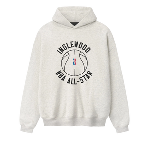 The Inglewood NBA All-Star 90s Hoodie is crafted from a 520GSM heavyweight cotton fleece and designed in a relaxed, 90s-inspired fit. The front showcases a puff-printed INGLEWOOD NBA ALL-STAR graphic alongside the official NBA logo, while the back showcases Essentials Fear of God. Additional features include side pockets, rib-knit cuffs and waist hem, and a Fear of God Essentials label accenting the hood.