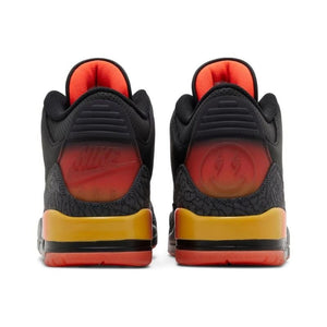 The J Balvin x Air Jordan 3 Retro 'Rio' takes its name from the reggaeton artist's son. The legacy silhouette carries a black leather upper with grey elephant print overlays at the forefoot and heel. Gradient accents in Solar Flare and Total Crimson Abyss coat the back tab, marked with Nike Air branding on the left foot and J Balvin's smiley face logo on the right. The sunset colors are repeated on the rear of the polyurethane midsole, supported by a red-tinged translucent rubber outsole.