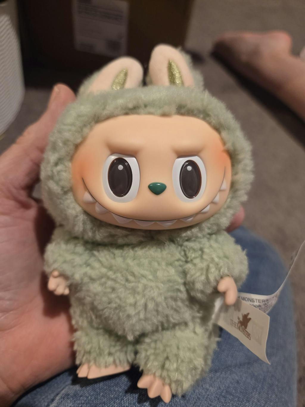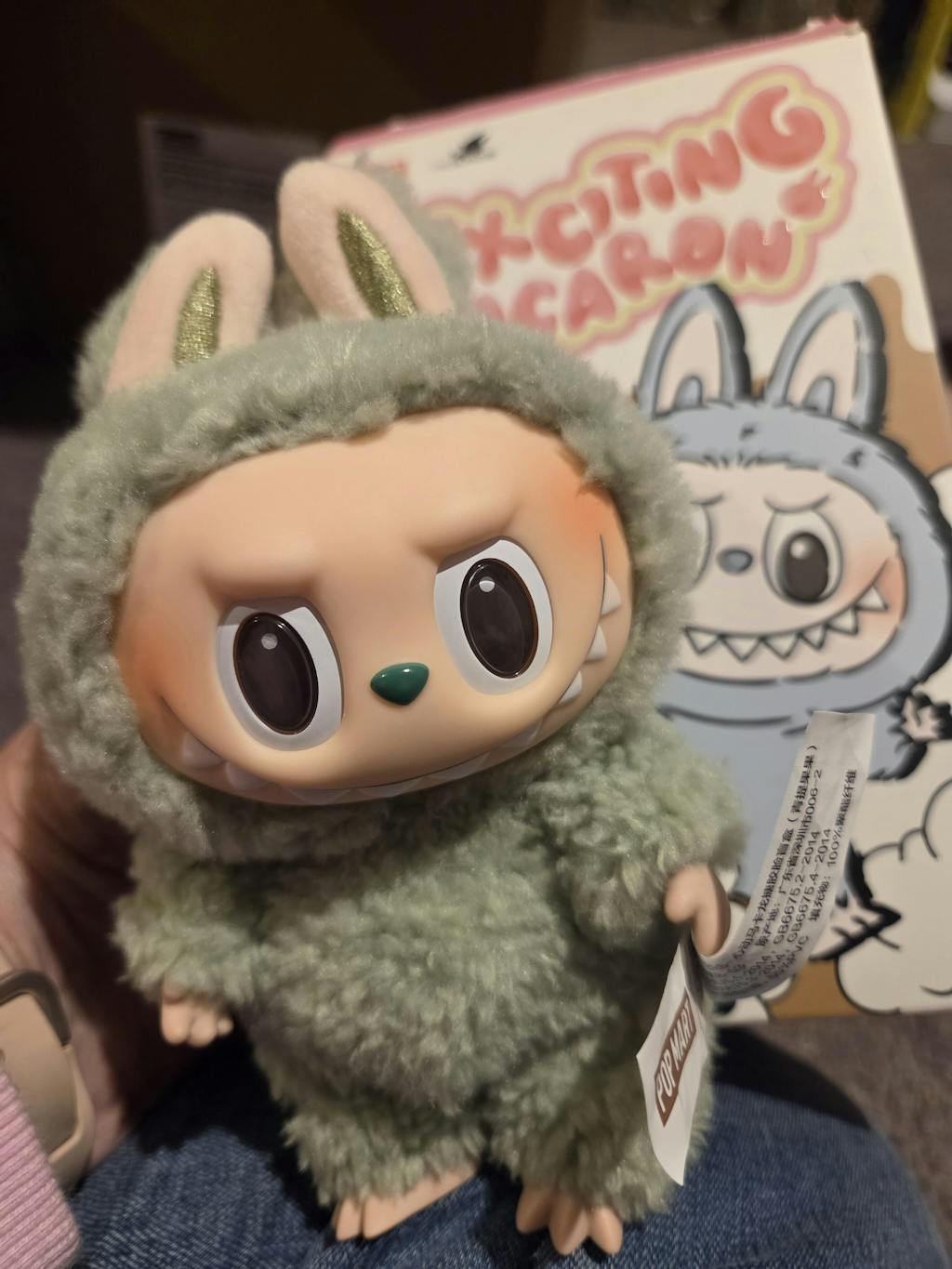 The set could include a miniature Labubu plushie with soft fur in light pink, baby blue, pale green, chocolate brown, cream, light gray, or beige. Each color mimics the pastel hue of a sweet macaroon. In addition, the plushie features a durable vinyl face and a key ring attachment. The key ring is crafted from gold-tone metal, and the ribbon attachment features "THE MONSTERS" in bold lettering. The collectible box conceals the toy within and displays macaroon-themed Labubu graphics. The front reads "EXCITING MACARONS" in pink bubble letters, plus "VINYL FACE" and "BOOM."